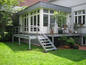 Terrassenpodest und Gartentreppe in Kombination mit einem Edelstahlgeländer